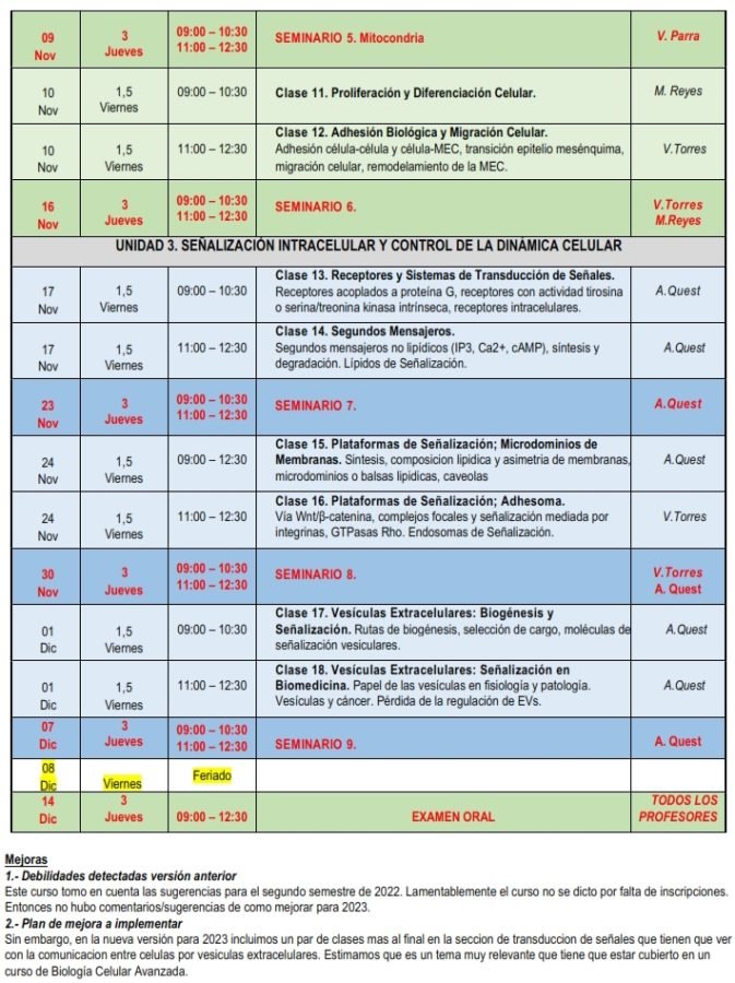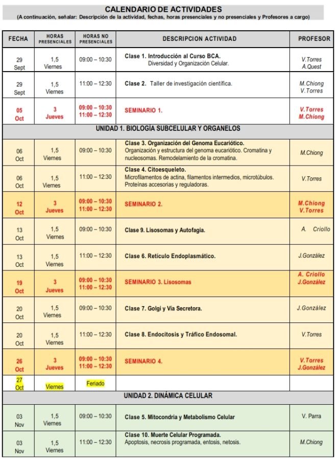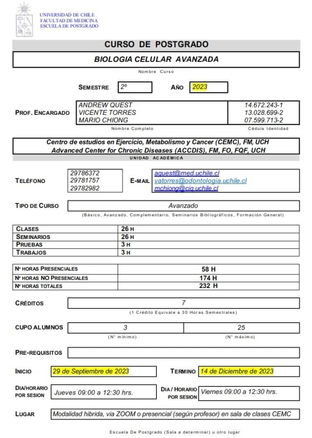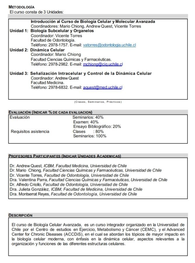 Advanced Cell Biology course is an integrative course focused on acquire updated knowledges of the greatest impact topics in modern cellular biology, with emphasis on cellular dynamics, organization relevant aspects and functions of different cellular structures.
