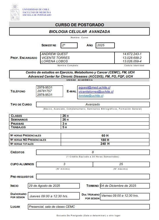 Biología Celular Avanzada es un curso integrador enfocado en adquirir conocimientos actualizados de los temas de mayor impacto en la biología celular moderna, con énfasis en la dinámica celular, aspectos relevantes de la organización y funciones de diferentes estructuras celulares.