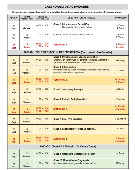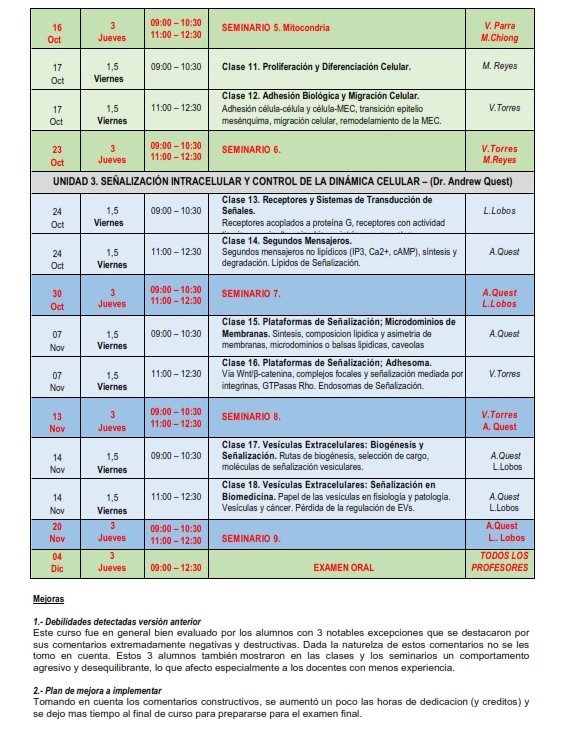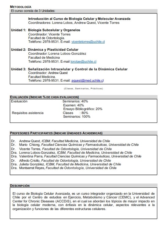 Advanced Cell Biology course is an integrative course focused on acquire updated knowledges of the greatest impact topics in modern cellular biology, with emphasis on cellular dynamics, organization relevant aspects and functions of different cellular structures.