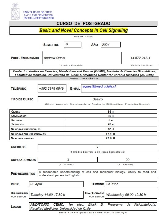 Main Objectives: Acquire basic to advanced knowledge in a number of signaling pathways relevant to the development of human diseases. Understand the mechanisms of signal transduction and how malfunction of such processes leads to disease.