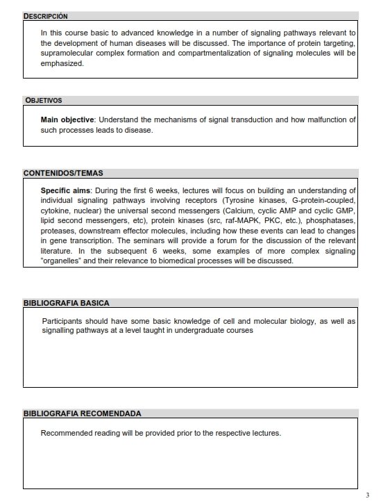 Objetivos principales: Adquirir conocimientos básicos y avanzados en una serie de vías de señalización relevantes para el desarrollo de las enfermedades humanas. Comprender los mecanismos de transducción de señales y cómo el mal funcionamiento de dichos procesos conduce a la enfermedad.