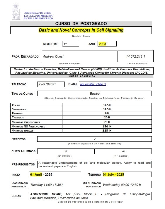 Main Objectives: Acquire basic to advanced knowledge in a number of signaling pathways relevant to the development of human diseases. Understand the mechanisms of signal transduction and how malfunction of such processes leads to disease.