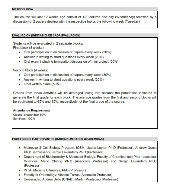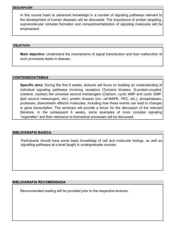 Objetivos principales: Adquirir conocimientos básicos y avanzados en una serie de vías de señalización relevantes para el desarrollo de las enfermedades humanas. Comprender los mecanismos de transducción de señales y cómo el mal funcionamiento de dichos procesos conduce a la enfermedad.