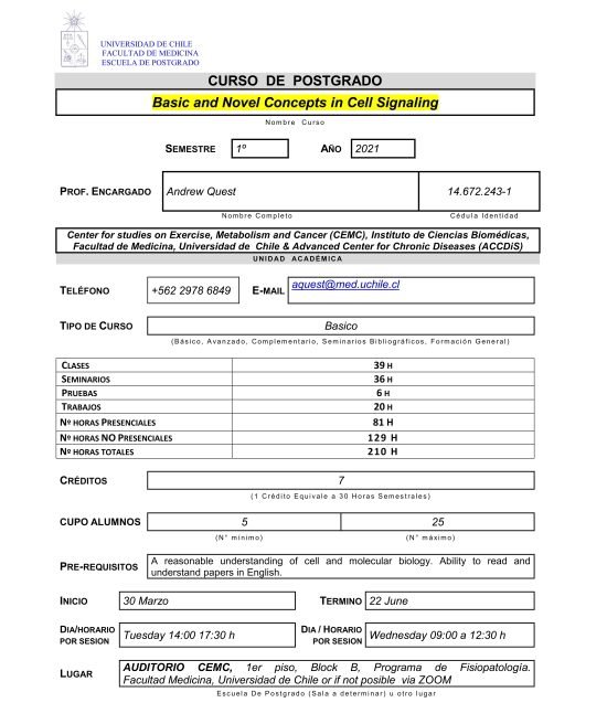 Main Objectives: Acquire basic to advanced knowledge in a number of signaling pathways relevant to the development of human diseases. Understand the mechanisms of signal transduction and how malfunction of such processes leads to disease.
