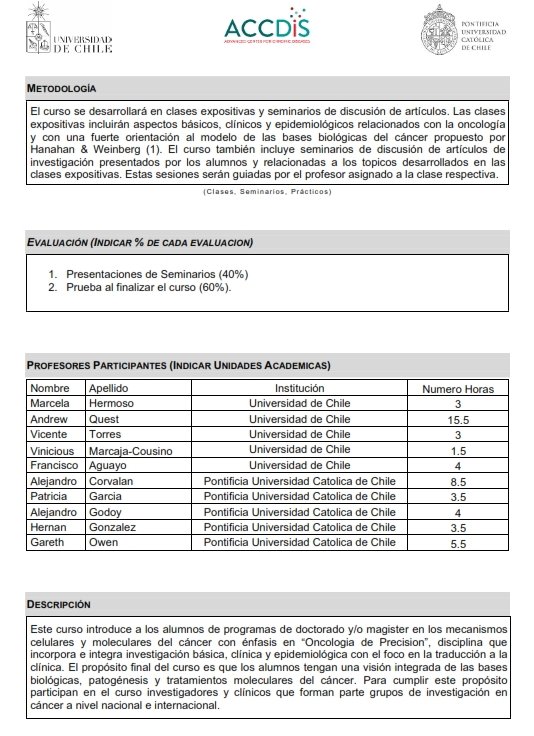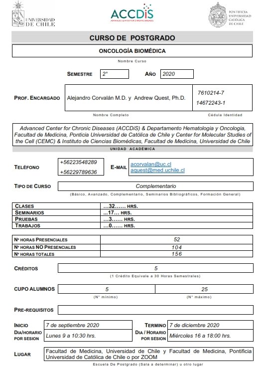 General Objectives: 1- Understand the biological mechanisms involved in the development of cancer and its projections in the pathogenesis and molecular treatments in oncology. 2- Understand cancer research methodologies and their applications in oncological translational research. Specific Objectives: 1- Know and identify the cellular and molecular phenomena involved in the etiology and pathogenesis of cancer. 2- Know the experimental strategies of basic, clinical and epidemiological research in cancer. 3- Integrate the cellular and molecular phenomena of cancer with characteristic clinical alterations associated with different types of cancer.