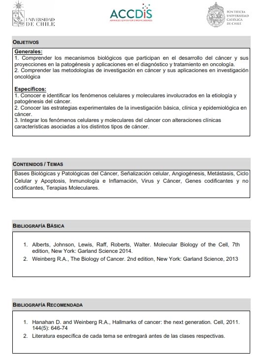 Objetivos Generales: 1- Comprender los mecanismos biológicos que participan en el desarrollo del cáncer y sus proyecciones en la patogénesis y tratamientos moleculares en oncología. 2- Comprender las metodologías de investigación en cáncer y sus aplicaciones en investigación traslacional oncológica. Objetivos Específicos: 1- Conocer e identificar los fenómenos celulares y moleculares involucrados en la etiología y patogénesis del cáncer. 2- Conocer las estrategias experimentales de la investigación básica, clínica y epidemiológica en cáncer. 3- Integrar los fenómenos celulares y moleculares del cáncer con alteraciones clínicas características asociadas a los distintos tipos de cáncer.