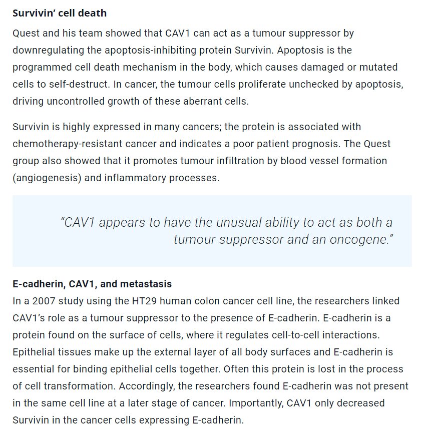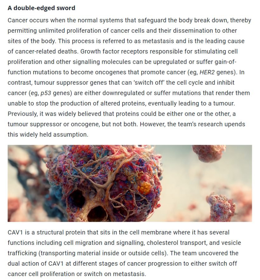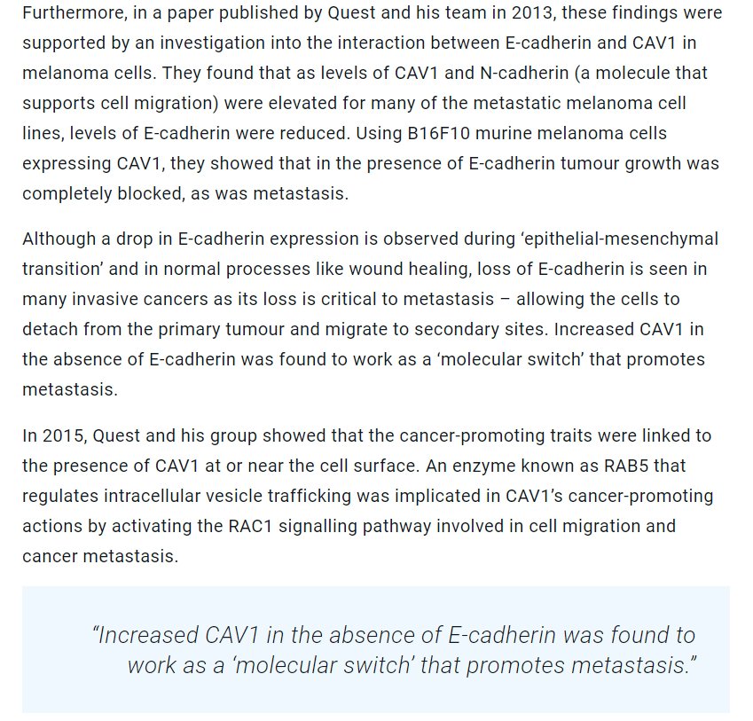 Professor Andrew Quest and his team at the University of Chile have spent the last 25 years investigating the role of a protein called caveolin-1 (CAV1). CAV1 appears to have the unusual ability to act as both a tumour suppressor and an oncogene. The researchers have significantly improved our understanding of the role that CAV1 plays in different forms of cancers such as melanoma, breast, and colon cancer – rethinking conventional wisdom on cancer development in the process.
