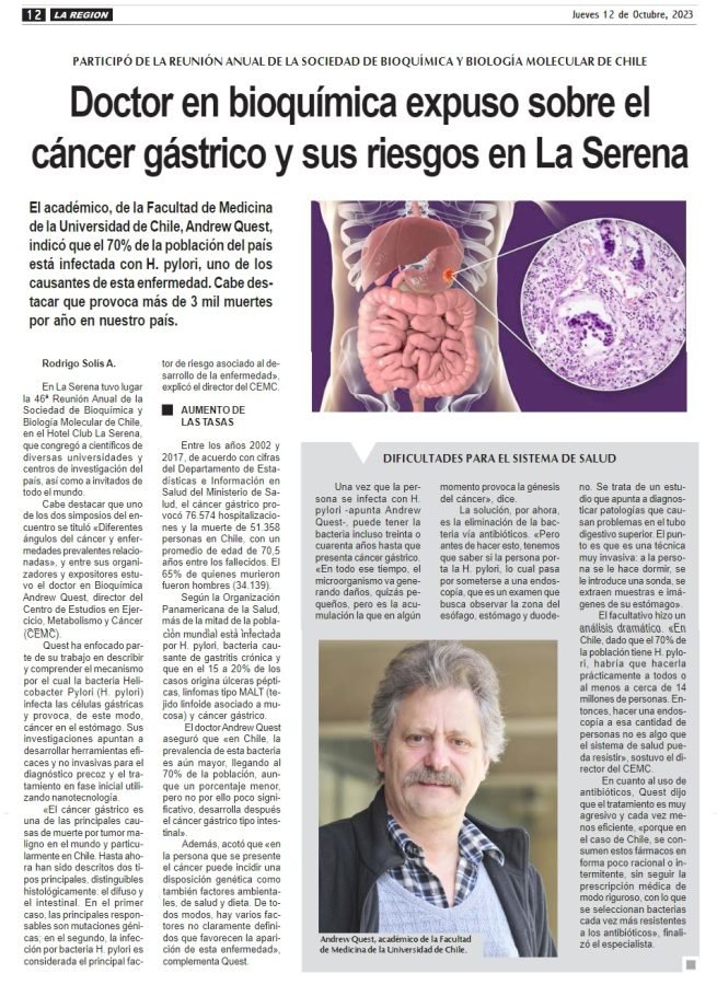 El académico, de la Facultad de Medicina de la Universidad de Chile, Andrew Quest, indicó que el 70% de la población del país está infectada con H. pylori, uno de los causantes de esta enfermedad. Cabe destacar que provoca más de 3 mil muertes por año en nuestro país.