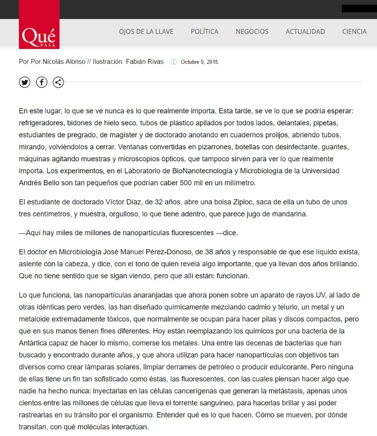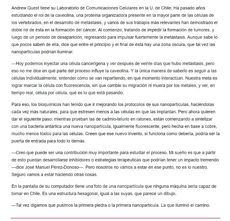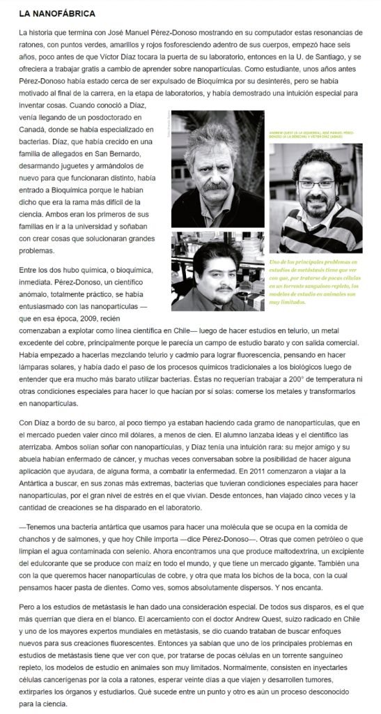 For four years, biochemists José Manuel Pérez-Donoso and Victor Diaz use Antarctic bacterias to design nanoparticles with various applications. Today, with Andrew Quest, they have an ambitious plan: use fluorescent nanoparticles to illuminate one of the darkest fields of cancer: the way how metastasis kills us.