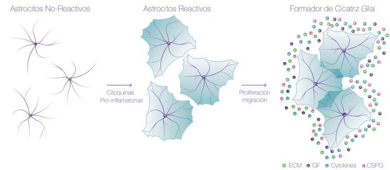 La gliosis es una reacción del cerebro a una lesión, en la cual las células gliales, como los astrocitos, se activan, se multiplican y cambian de forma para ayudar a reparar el daño. Estas células producen proteínas (citoquinas) que impulsan la inflamación para defenderse, pero, si esta respuesta es demasiado intensa o se prolonga por mucho tiempo, los astrocitos pueden volverse tóxicos para el cerebro, contribuyendo a una inflamación crónica que puede agravar el daño cerebral. Este fenómeno tiene un doble filo: por un lado, los astrocitos protegen al cerebro, pero si su reacción no es controlada, pueden acabar dañando las células nerviosas y empeorando la condición de enfermedades como el Alzheimer o la esclerosis lateral amiotrófica (ELA). En otras palabras, la gliosis puede ser tanto protectora como perjudicial, dependiendo de cómo se regule.