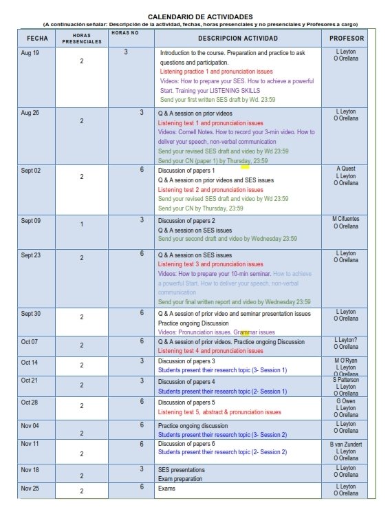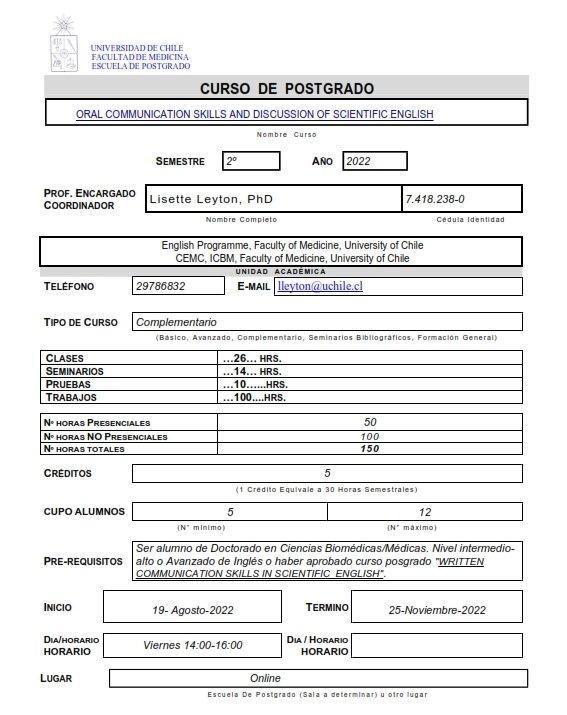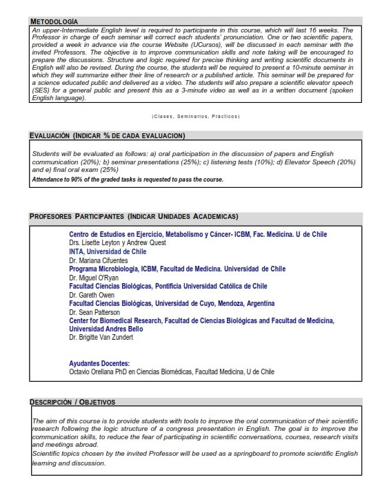 El objetivo de este curso es proporcionar a los estudiantes herramientas para mejorar la comunicación oral de su investigación científica siguiendo la estructura lógica de una presentación de congreso en inglés. El objetivo es mejorar las habilidades de comunicación, reducir el miedo a participar en conversaciones científicas, cursos, visitas de investigación y reuniones en el extranjero. Los temas científicos elegidos por el profesor invitado, cuyo idioma nativo es el inglés, se utilizarán como un trampolín para promover el aprendizaje y la discusión científica en inglés.