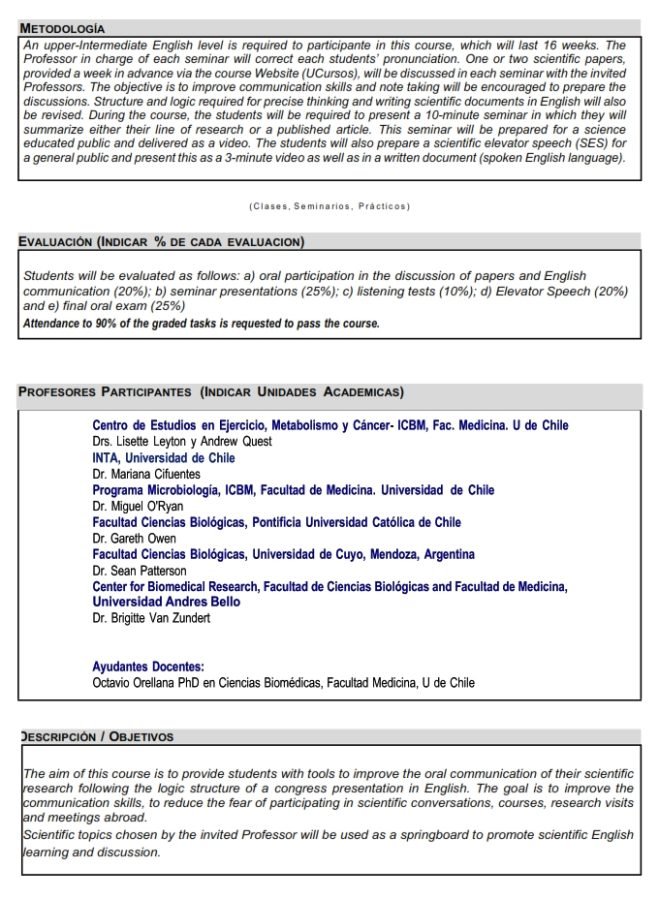El objetivo de este curso es proporcionar a los estudiantes herramientas para mejorar la comunicación oral de su investigación científica siguiendo la estructura lógica de una presentación de congreso en inglés. El objetivo es mejorar las habilidades de comunicación, reducir el miedo a participar en conversaciones científicas, cursos, visitas de investigación y reuniones en el extranjero. Los temas científicos elegidos por el profesor invitado, cuyo idioma nativo es el inglés, se utilizarán como un trampolín para promover el aprendizaje y la discusión científica en inglés.