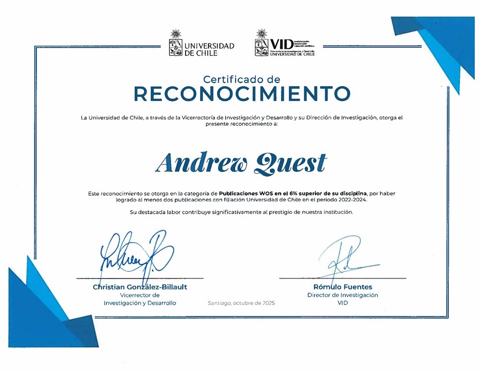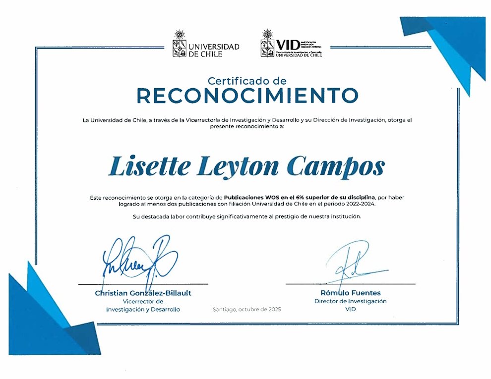 - Reconocimiento por haber logrado al menos dos publicaciones en el top 6% de su disciplina, con filiación Universidad de Chile, entre el 2022-2024