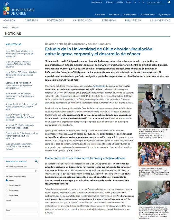 Un estudio publicado recientemente por la revista Antioxidants dio cuenta de los vínculos que existen entre distintos tipos de cáncer y el tejido adiposo, más conocido como grasa corporal, un trabajo encabezado por el profesor Andrew Quest, director del Centro de Estudios sobre Ejercicio, Metabolismo y Cáncer (CEMC) del Instituto de Ciencias Biomédicas (ICBM) de la Facultad de Medicina de la U. de Chile, junto al equipo de la doctora Mariana Cifuentes, académica del Instituto de Nutrición y Tecnología de los Alimentos (INTA) del mismo plantel.