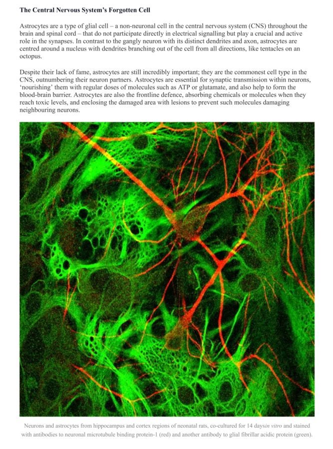 If someone brings up the topic of neuroscience, or the nervous system, several cells or molecules might come to your mind. The scrawny neurons within the brain, connected to their neighbours in an unfathomably complex network. Or the neurotransmitters sent by neurons as signals, with famous faces like dopamine or serotonin. However, one cell you likely wouldn’t mention is the astrocyte.