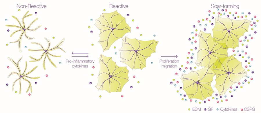 Reactive astrocytes help to form the glial scar. Once the scar has formed, astrocytes settle at the scar,