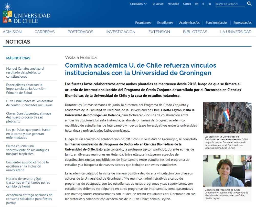 Durante las últimas semanas de junio, la directora del Programa de Grado Conjunto y académica de la Facultad de Medicina de la Universidad de Chile, Lisette Leyton, visitó la Universidad de Groningen en Holanda, para fortalecer vínculos de colaboración entre ambas instituciones. En esta instancia, se abordaron temas de progreso académico, movilidad de estudiantes de intercambio y nuevos lazos investigativos entre la universidad holandesa y universidades latinoamericanas.