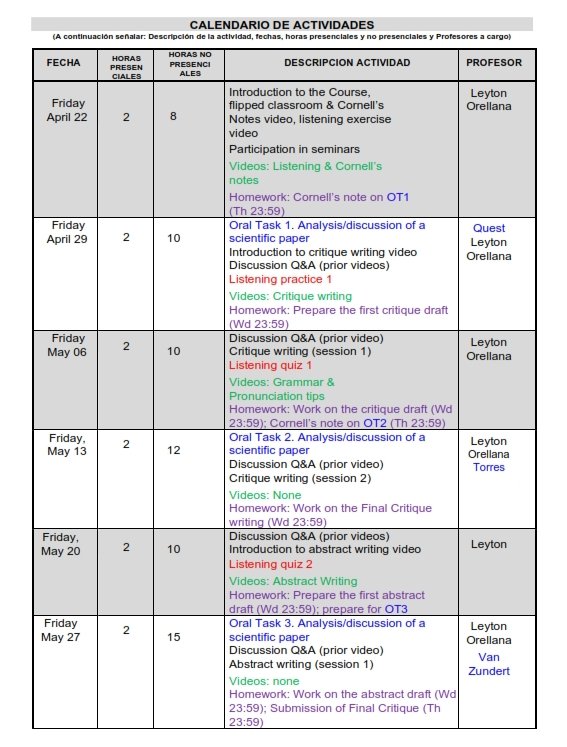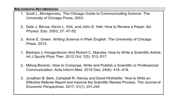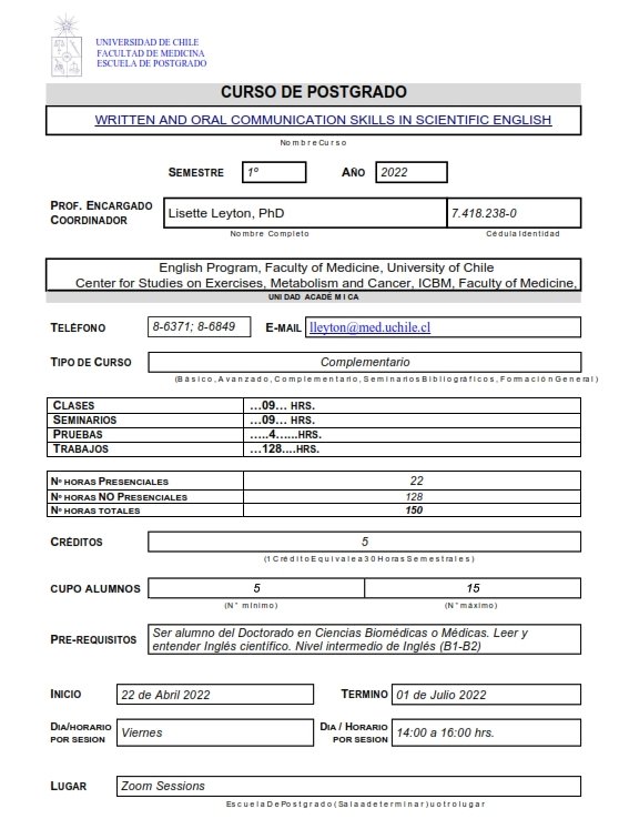El objetivo de este curso es proporcionar a los estudiantes las herramientas lingüísticas para mejorar la comunicación oral y escrita de su investigación científica en inglés. Se hará hincapié en los patrones estructurales esenciales para la redacción adecuada de documentos científicos relacionados, como críticas, resúmenes y cartas de presentación. Además, el curso tiene como objetivo desarrollar algunas estrategias de habilidades de escucha, que son clave para mejorar la pronunciación de palabras y expresiones que son difíciles para los hispanohablantes cuando comunican su investigación. El curso se basará en muestras reales de artículos, resúmenes, cartas y charlas científicas impartidas por profesores invitados de la Facultad de Medicina y otras instituciones cuyo idioma nativo es el inglés o que publican y hablan inglés a un nivel avanzado.