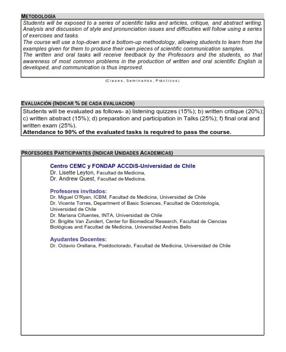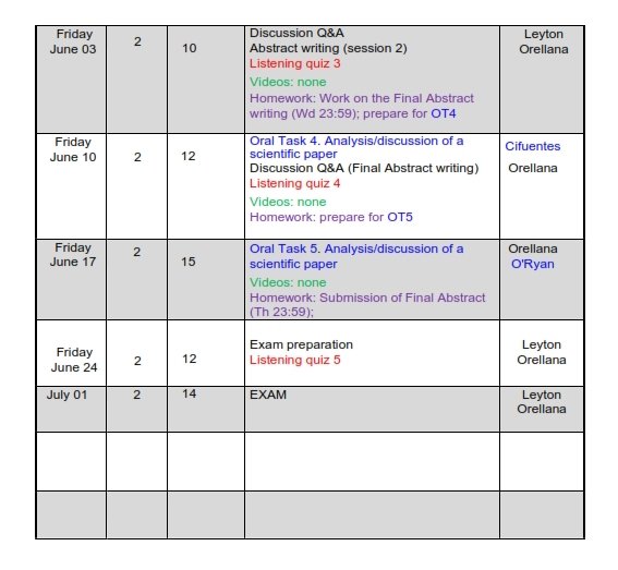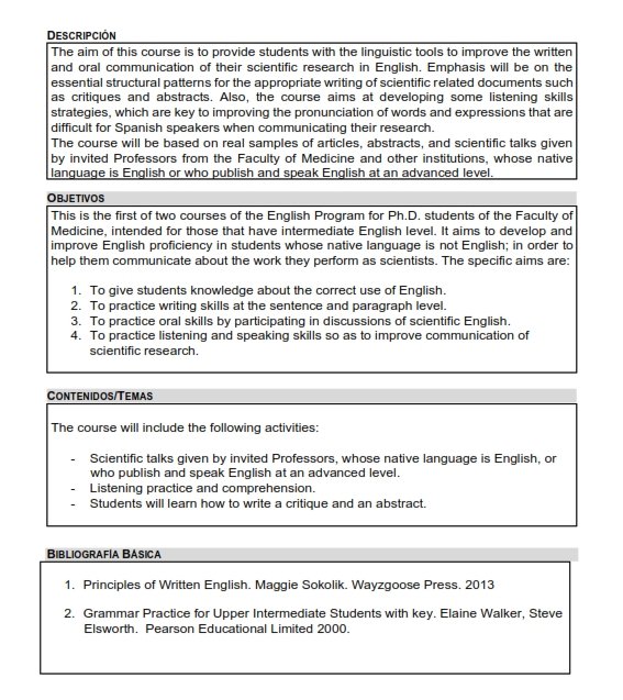 The aim of this course is to provide students with the linguistic tools to improve the written and oral communication of their scientific research in English. Emphasis will be on the essential structural patterns for the appropriate writing of scientific related documents such as critiques, abstracts, and cover letters. Also, the course aims at developing some listening skills strategies, which are key to improving the pronunciation of words and expressions that are difficult for Spanish speakers when communicating their research. The course will be based on real samples of articles, abstracts, letters and scientific talks given by invited Professors from the Faculty of Medicine and other institutions, whose native language is English or who publish and speak English at an advanced level.