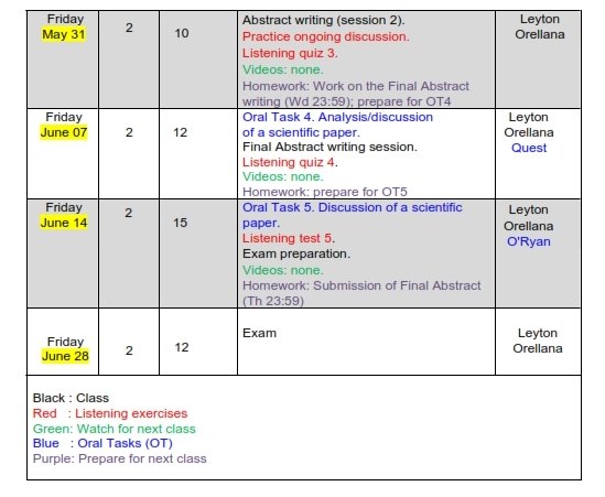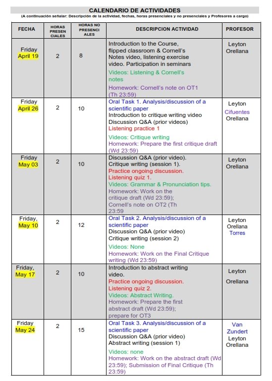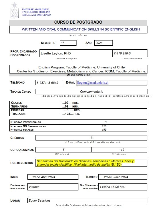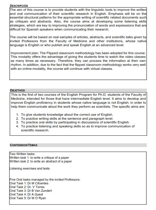 The aim of this course is to provide students with the linguistic tools to improve the written and oral communication of their scientific research in English. Emphasis will be on the essential structural patterns for the appropriate writing of scientific related documents such as critiques, abstracts, and cover letters. Also, the course aims at developing some listening skills strategies, which are key to improving the pronunciation of words and expressions that are difficult for Spanish speakers when communicating their research. The course will be based on real samples of articles, abstracts, letters and scientific talks given by invited Professors from the Faculty of Medicine and other institutions, whose native language is English or who publish and speak English at an advanced level.