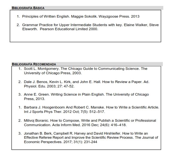 El objetivo de este curso es proporcionar a los estudiantes las herramientas lingüísticas para mejorar la comunicación oral y escrita de su investigación científica en inglés. Se hará hincapié en los patrones estructurales esenciales para la redacción adecuada de documentos científicos relacionados, como críticas, resúmenes y cartas de presentación. Además, el curso tiene como objetivo desarrollar algunas estrategias de habilidades de escucha, que son clave para mejorar la pronunciación de palabras y expresiones que son difíciles para los hispanohablantes cuando comunican su investigación. El curso se basará en muestras reales de artículos, resúmenes, cartas y charlas científicas impartidas por profesores invitados de la Facultad de Medicina y otras instituciones cuyo idioma nativo es el inglés o que publican y hablan inglés a un nivel avanzado.