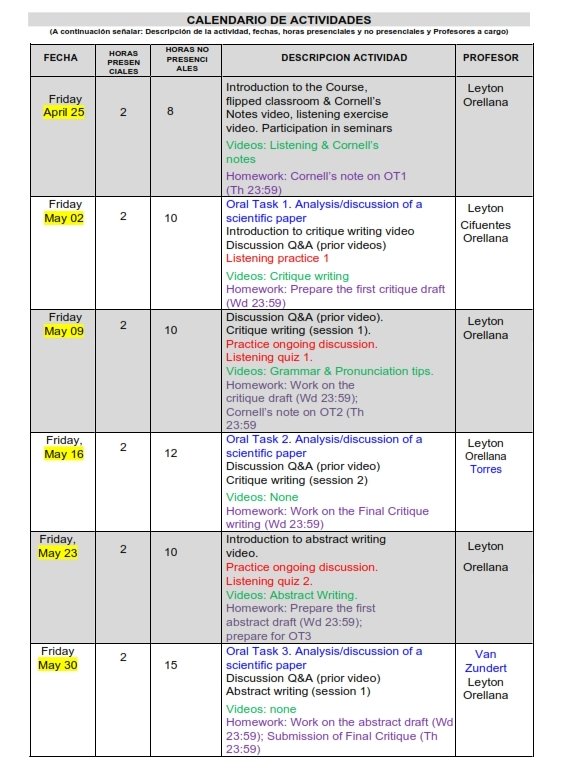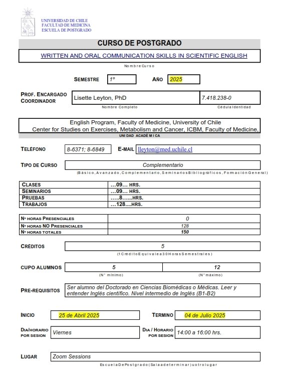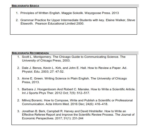 El objetivo de este curso es proporcionar a los estudiantes las herramientas lingüísticas para mejorar la comunicación oral y escrita de su investigación científica en inglés. Se hará hincapié en los patrones estructurales esenciales para la redacción adecuada de documentos científicos relacionados, como críticas, resúmenes y cartas de presentación. Además, el curso tiene como objetivo desarrollar algunas estrategias de habilidades de escucha, que son clave para mejorar la pronunciación de palabras y expresiones que son difíciles para los hispanohablantes cuando comunican su investigación. El curso se basará en muestras reales de artículos, resúmenes, cartas y charlas científicas impartidas por profesores invitados de la Facultad de Medicina y otras instituciones cuyo idioma nativo es el inglés o que publican y hablan inglés a un nivel avanzado.