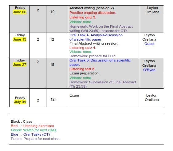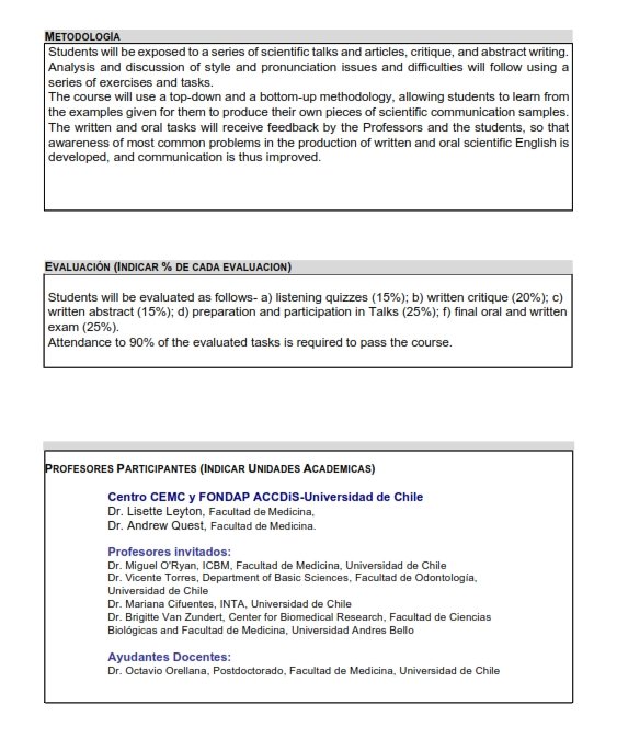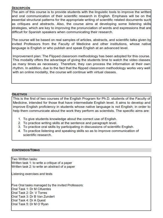 The aim of this course is to provide students with the linguistic tools to improve the written and oral communication of their scientific research in English. Emphasis will be on the essential structural patterns for the appropriate writing of scientific related documents such as critiques, abstracts, and cover letters. Also, the course aims at developing some listening skills strategies, which are key to improving the pronunciation of words and expressions that are difficult for Spanish speakers when communicating their research. The course will be based on real samples of articles, abstracts, letters and scientific talks given by invited Professors from the Faculty of Medicine and other institutions, whose native language is English or who publish and speak English at an advanced level.