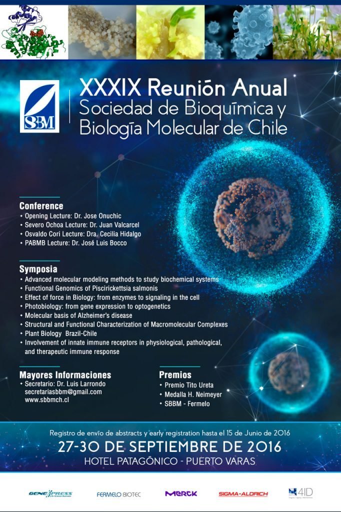 The Annual Meeting of the XXXIX Chile’s Biochemistry and Molecular Biology Society took place in September 27-30, 2016 at the Hotel Patagonico in the city of Puerto Varas. Scientists from all over Chile attended this meeting.